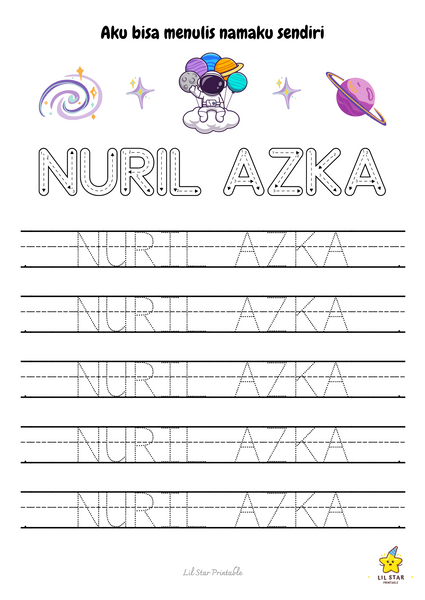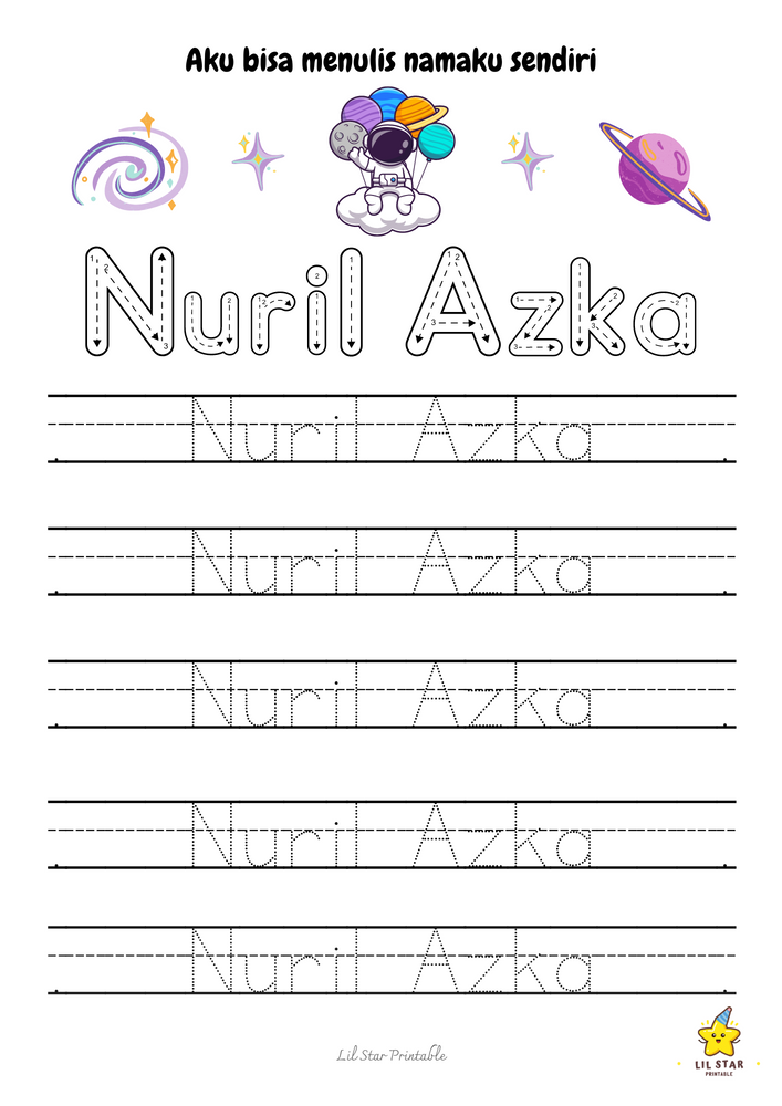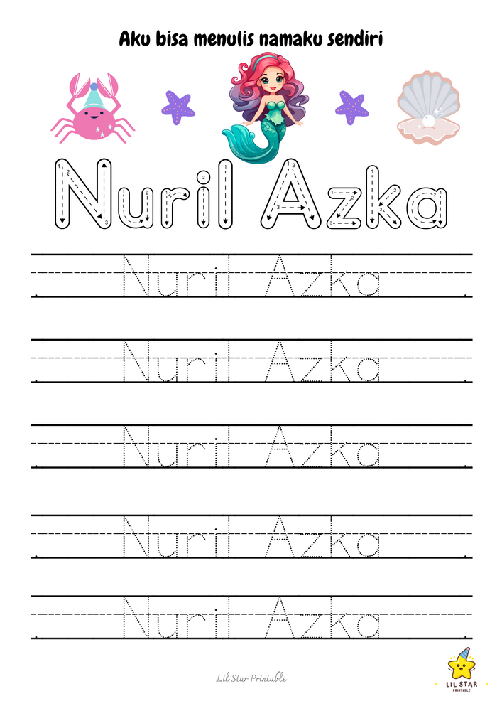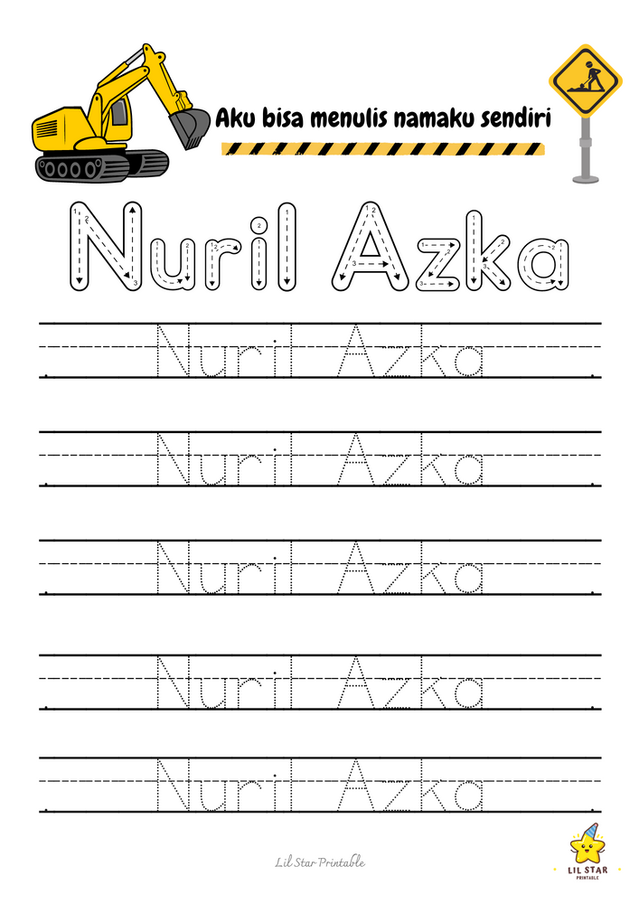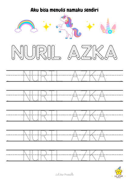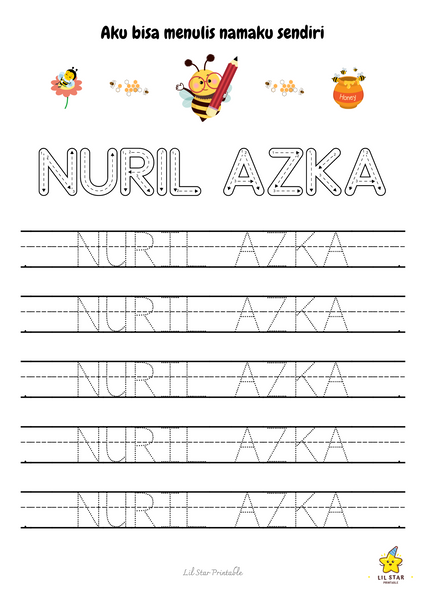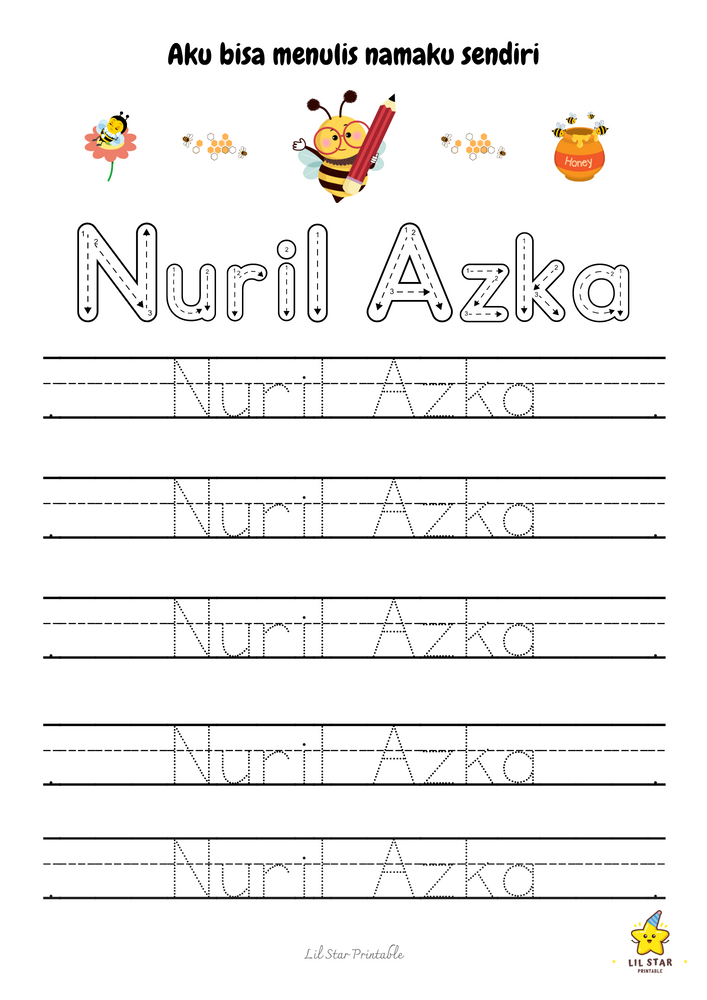 Worksheet trace my name ini menampilkan formasi huruf yang jelas dan menarik secara visual, membantu si kecil mengenali dan mengingat huruf dalam namanya. Ini membangun fondasi yang kuat untuk membaca dan menulis.